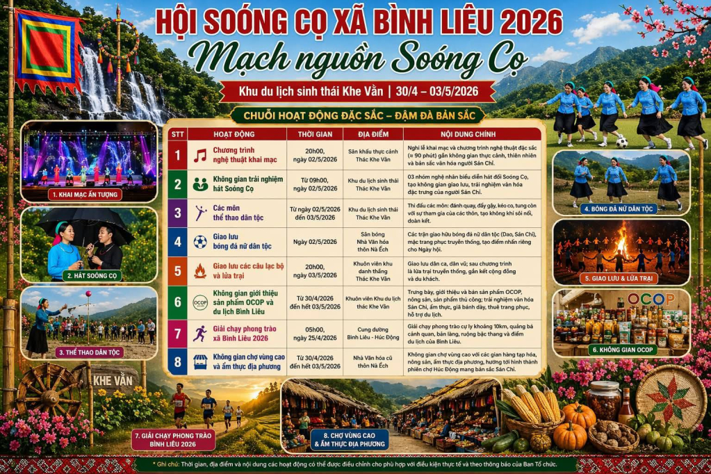 Từ ngày 30/4 đến 3/5/2026, tại Khu du lịch sinh thái thác Khe Vằn, UBND xã Bình Liêu (tỉnh Quảng Ninh) sẽ tổ chức Ngày hội Soóng Cọ năm 2026 với chủ đề “Âm vang Soóng Cọ - Kết nối bản sắc, lan tỏa du lịch Bình Liêu”, qua đó nhằm bảo tồn, phát huy giá trị văn hóa dân tộc Sán Chỉ và kích cầu du lịch dịp nghỉ lễ 30/4 - 1/5.